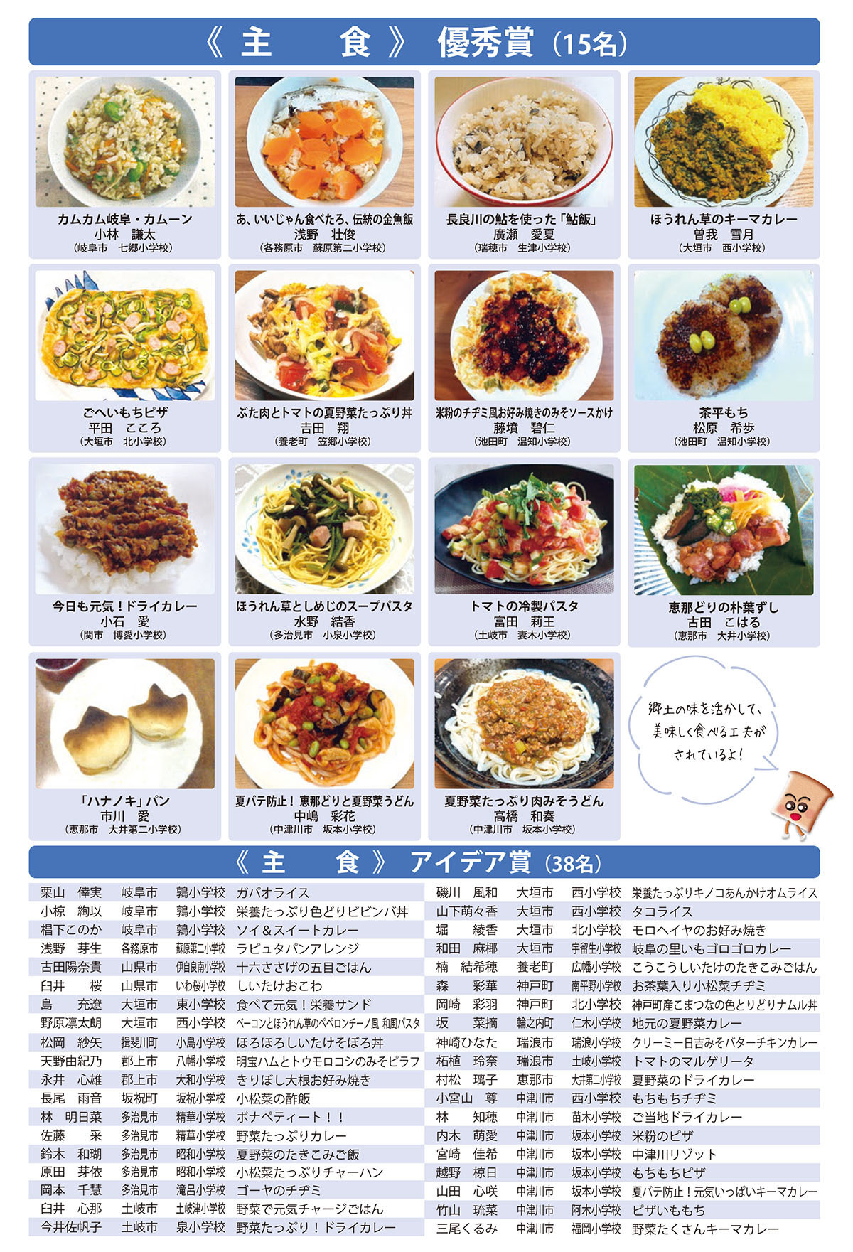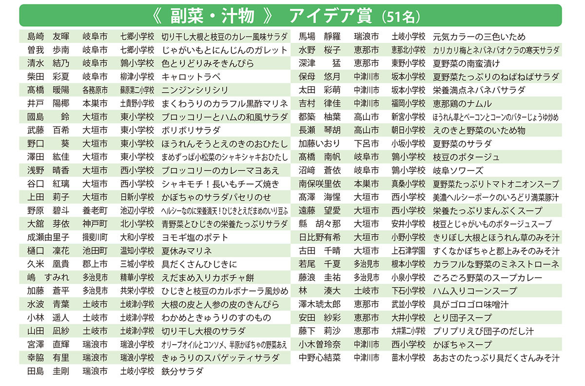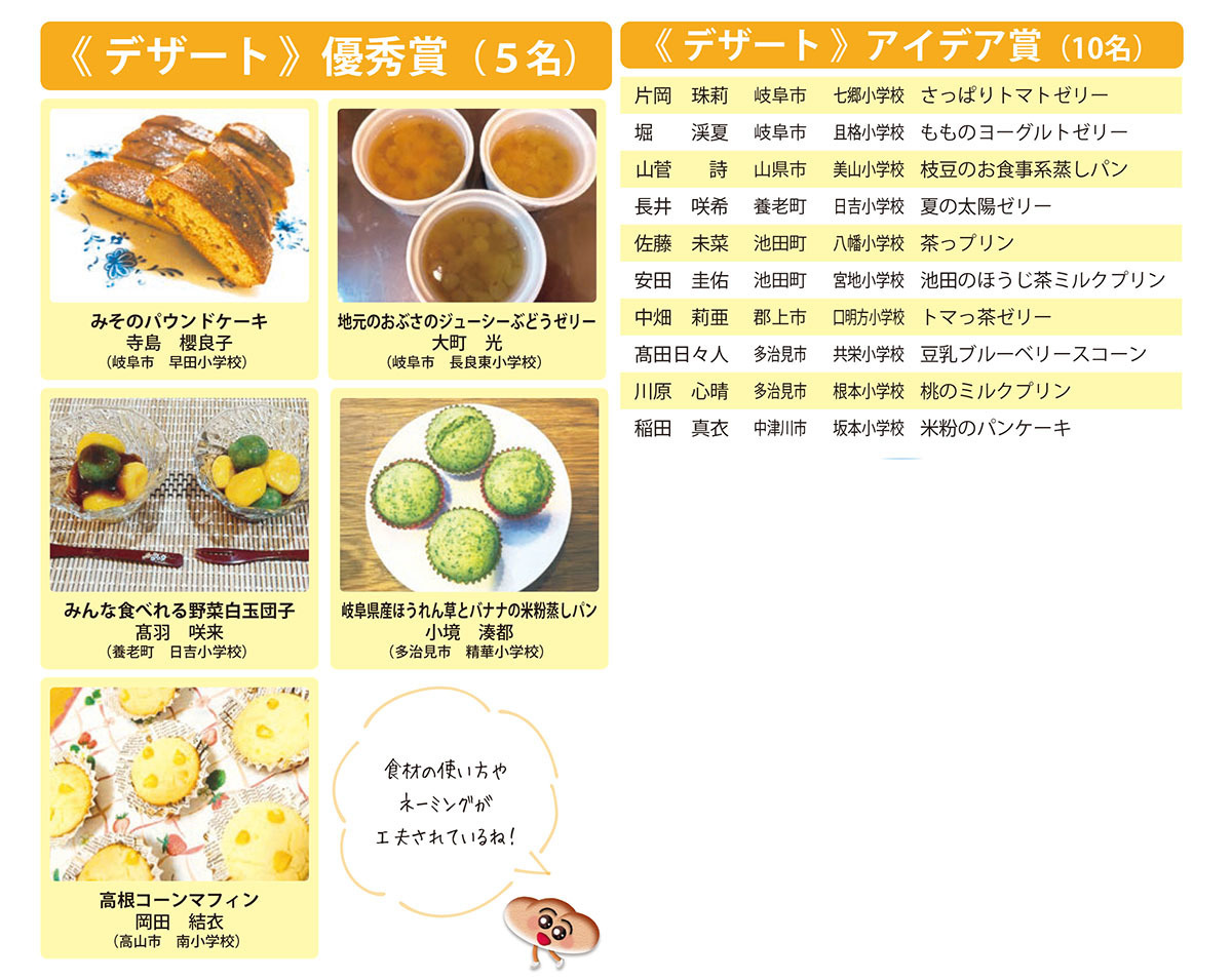 県内の小学校6年生児童から応募があった、地場産物を使用した学校給食にふさわしい1品料理を審査し、主食、主菜、副菜・汁物、デザートの4つの部門ごとに「優秀賞」と「アイデア賞」を決定しました。