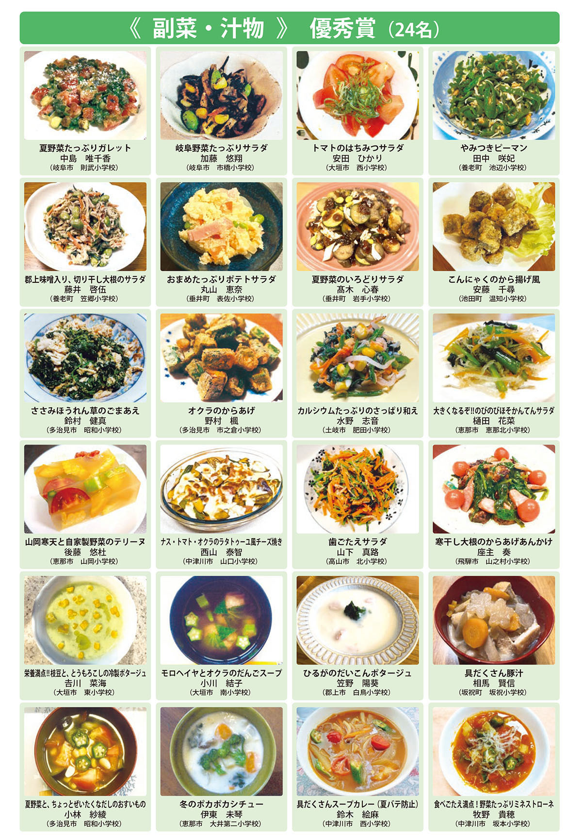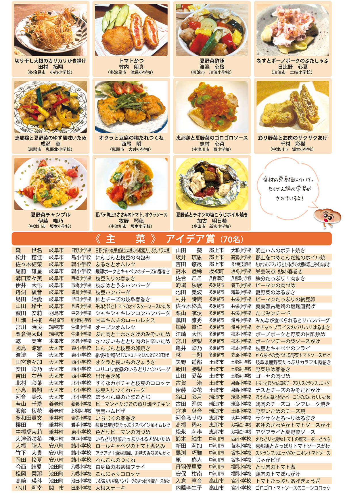 県内の小学校6年生児童から応募があった、地場産物を使用した学校給食にふさわしい1品料理を審査し、主食、主菜、副菜・汁物、デザートの4つの部門ごとに「優秀賞」と「アイデア賞」を決定しました。